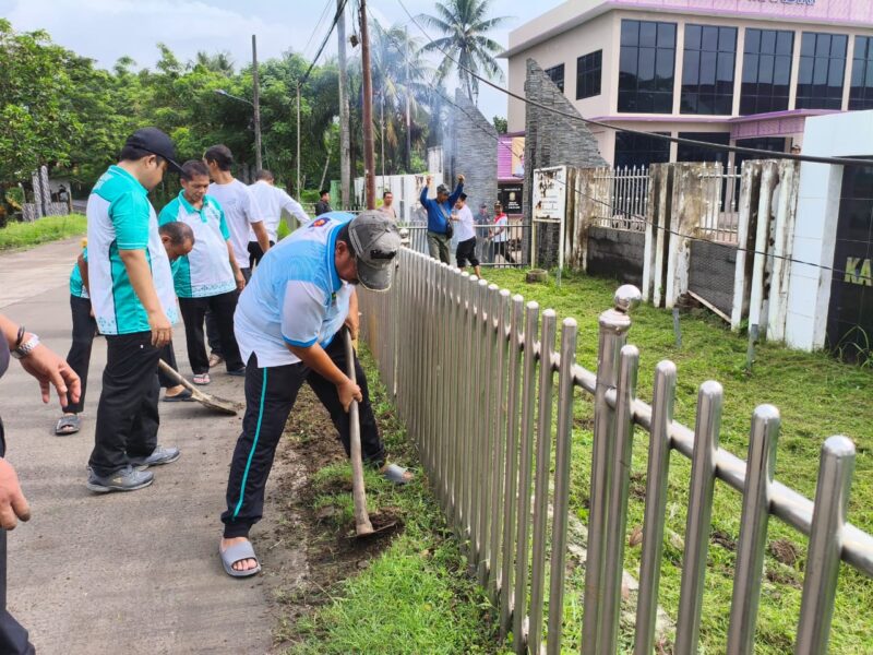 seluruh Pegawai Pemerintahan kecamatan sukadiri saling bergotong royong membersihkan lingkungan tempat kerja dan area tembok luar pinggir jalan halaman depan, Jum’at (6/2/2026).