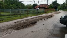 Tumpahan tanah yang menempel di badan jalan dikeluhkan warga Sukadiri.